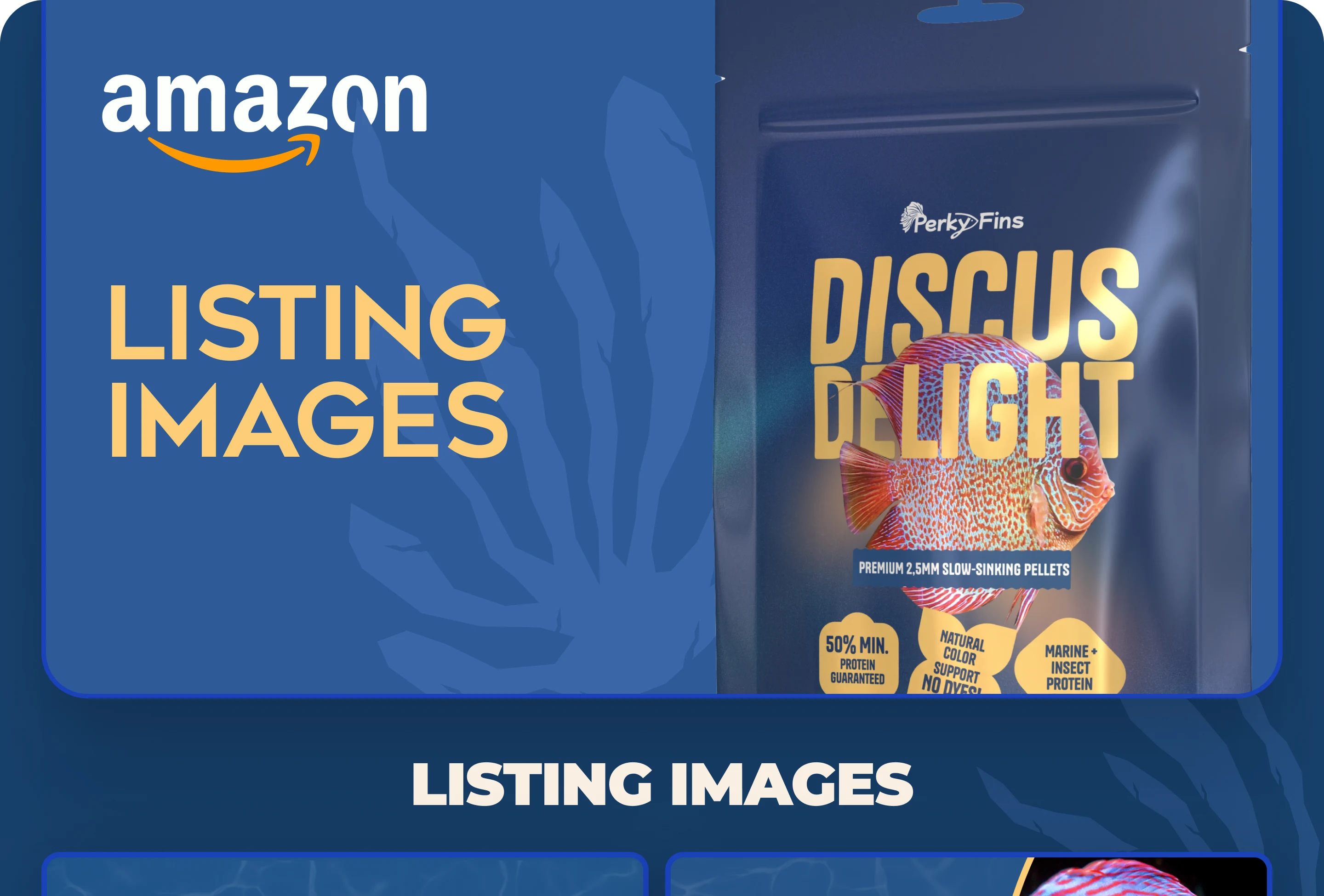 The client needed to develop branding and packaging design from scratch, create 3D renders of the product for marketing materials, and prepare high-conversion listings for a successful Amazon launch. The main task was to emphasize the premium quality, natural ingredients, and effectiveness of the discus fish feed.